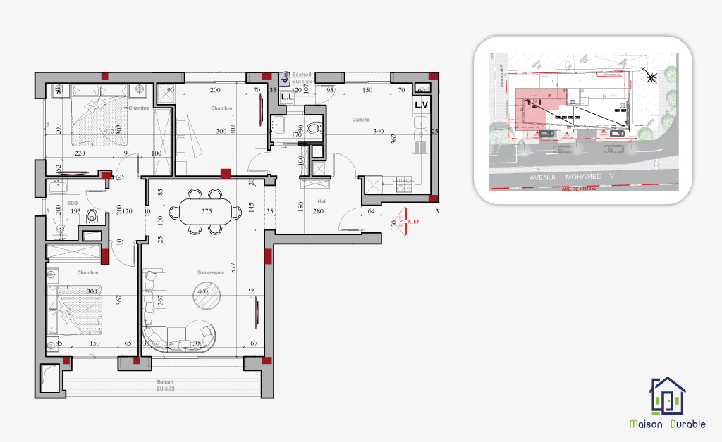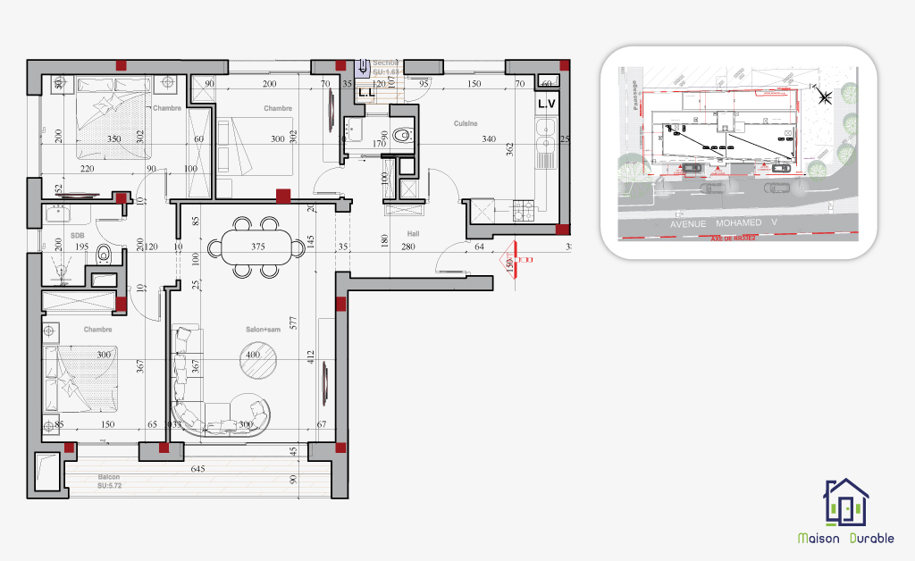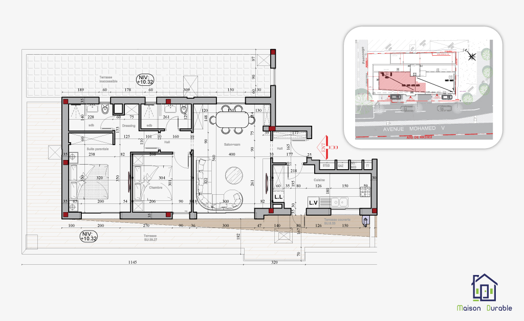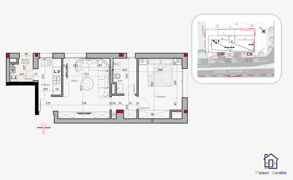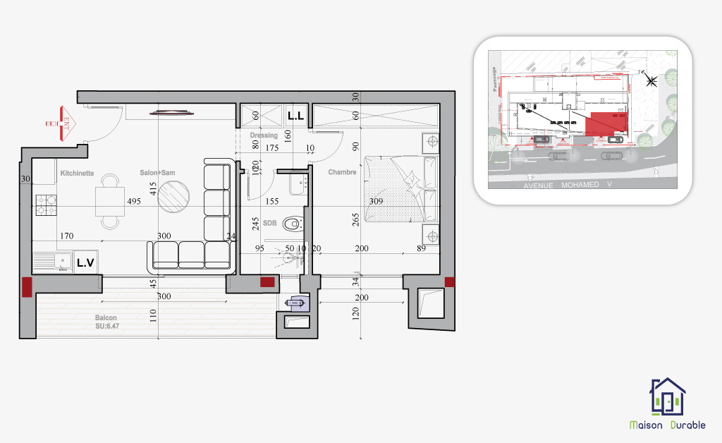Tous les appartements disposent d’espaces extérieurs (terrasses ou balcons) et ont tous au moins une ouverture sur l’avenue Mohamed V.